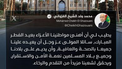 هنأ الرئيس محمد ولد الشيخ الغزواني، اليوم الخميس، الشعب الموريتاني بمناسبة حلول عيد الفطر المبارك.…