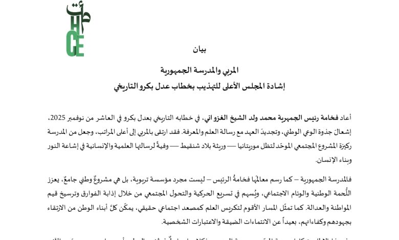 أعاد فخامة رئيس الجمهرية محمد ولد الشيخ الغزواني، في خطابه التاريخي بعدل بكرو في العاشر من نوفمبر 2025، إشعالَ جذوة الوعي الوطني، وتجديدَ العهد مع رسالة العلم والمعرفة. فقد ارتقى بالمربي إلى أعلى المراتب، وجعل من المدرسة ركيزة المشروع المجتمعي الموحّد لتظل موريتانيا — وريثة بلاد شنقيط — وفيةً لرسالتها العلمية والإنسانية في إشاعة النور وبناء الإنسان.