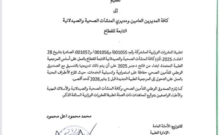تعميم بخصوص المرجعية الطبية موجه إلى كافة المنشآت الصحية والصيدلانية التابعة للقطاع