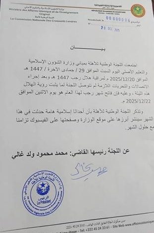 أعلنت اللجنة الوطنية للأهلة أنه ثبتت لديخا رؤية هلال شهر رجب لعام 1447 هـ،وءلك يوم الإثنين الموافق 22/12/2025 .