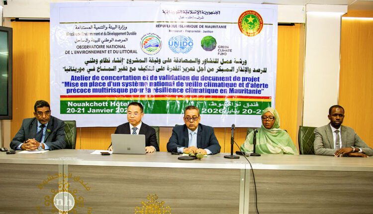 أشرف الأمين العام لوزارة البيئة والتنمية المستدامة، السيد مولاي إبراهيم ولد مولاي إبراهيم، اليوم الثلاثاء في نواكشوط، على افتتاح ورشة تشاورية للمصادقة على وثيقة مشروع “إنشاء نظام وطني للرصد والإنذار المبكر من أجل تعزيز القدرة على التكيف مع التغيرات المناخية في موريتانيا”، وذلك ضمن أنشطة المرصد الوطني للبيئة والساحل.