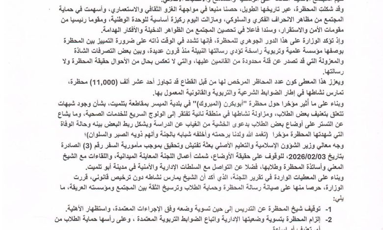 وبناء على المعطيات الواردة في تقرير اللجنة، الذي أكد أن الشيخ يمارس نشاطه دون ترخيص قانوني، قررت الوزارة، حرصا منها على صيانة رسالة المحظرة وحماية الطلاب وترسيخ الثقة بين المجتمع ومؤسسته العريقة، ما يلي:
