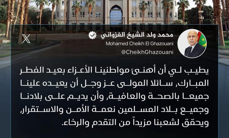 هنأ الرئيس محمد ولد الشيخ الغزواني، اليوم الخميس، الشعب الموريتاني بمناسبة حلول عيد الفطر المبارك.