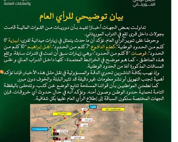 “تداولت بعض الجهات أخبارًا تفيد بأن دوريات من القوات المالية قامت بجولات داخل قرى تقع في التراب الموريتاني.