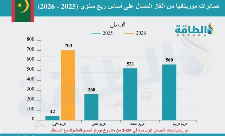ويرصد الرسم البياني الآتي -أعدته وحدة أبحاث الطاقة- صادرات موريتانيا من الغاز المسال على أساس فصلي (2025-2026):