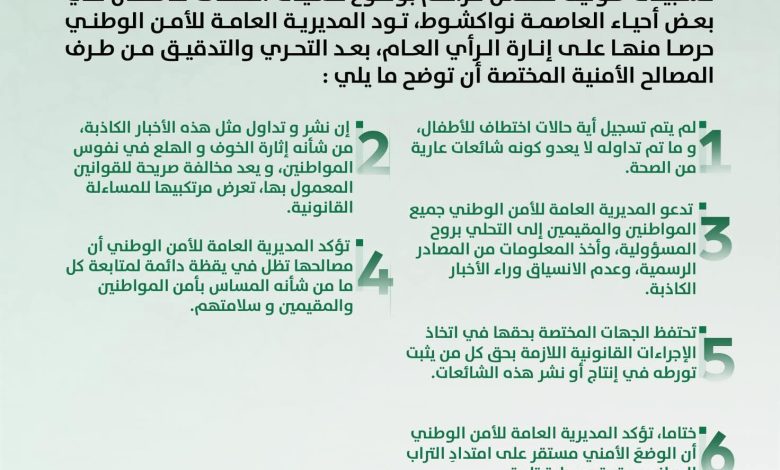 أعلنتت المديرية العامة للشرطة، في بيان على صفحتها،ما تم تداوله مؤخراً عبر بعض منصات التواصل الاجتماعي،من مزاعم حول تسجيل حالات اختطاف أطفال في بعض أحياء العاصمة نواكشوط، لا أساس له من الصحة، وأنه بعد التحريات والتدقيق من طرف المصالح الأمنية المختصة، لم يتم تسجيل أي حالة اختطاف للأطفال، مؤكدة أن ما يُتداول في هذا السياق لا يعدو كونه شائعات ومعلومات مضللة.